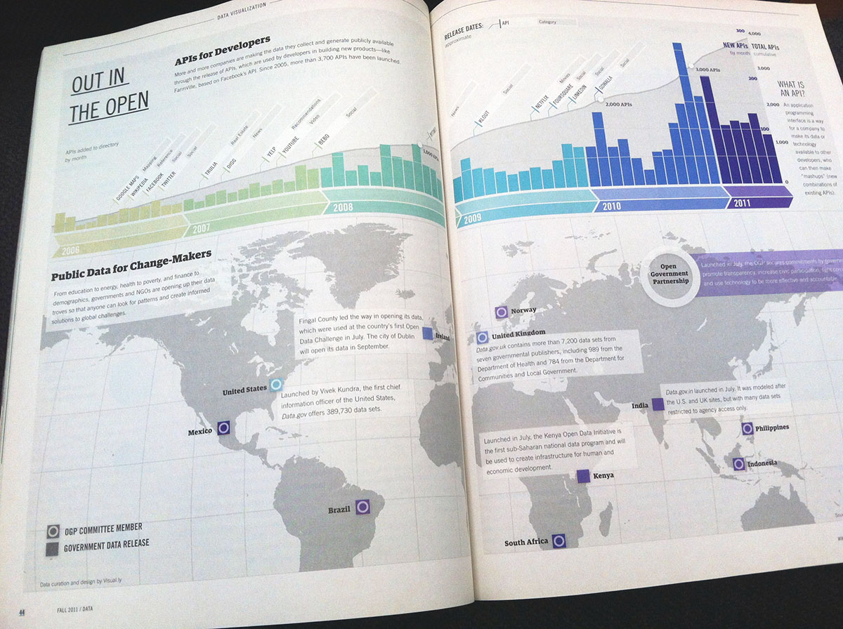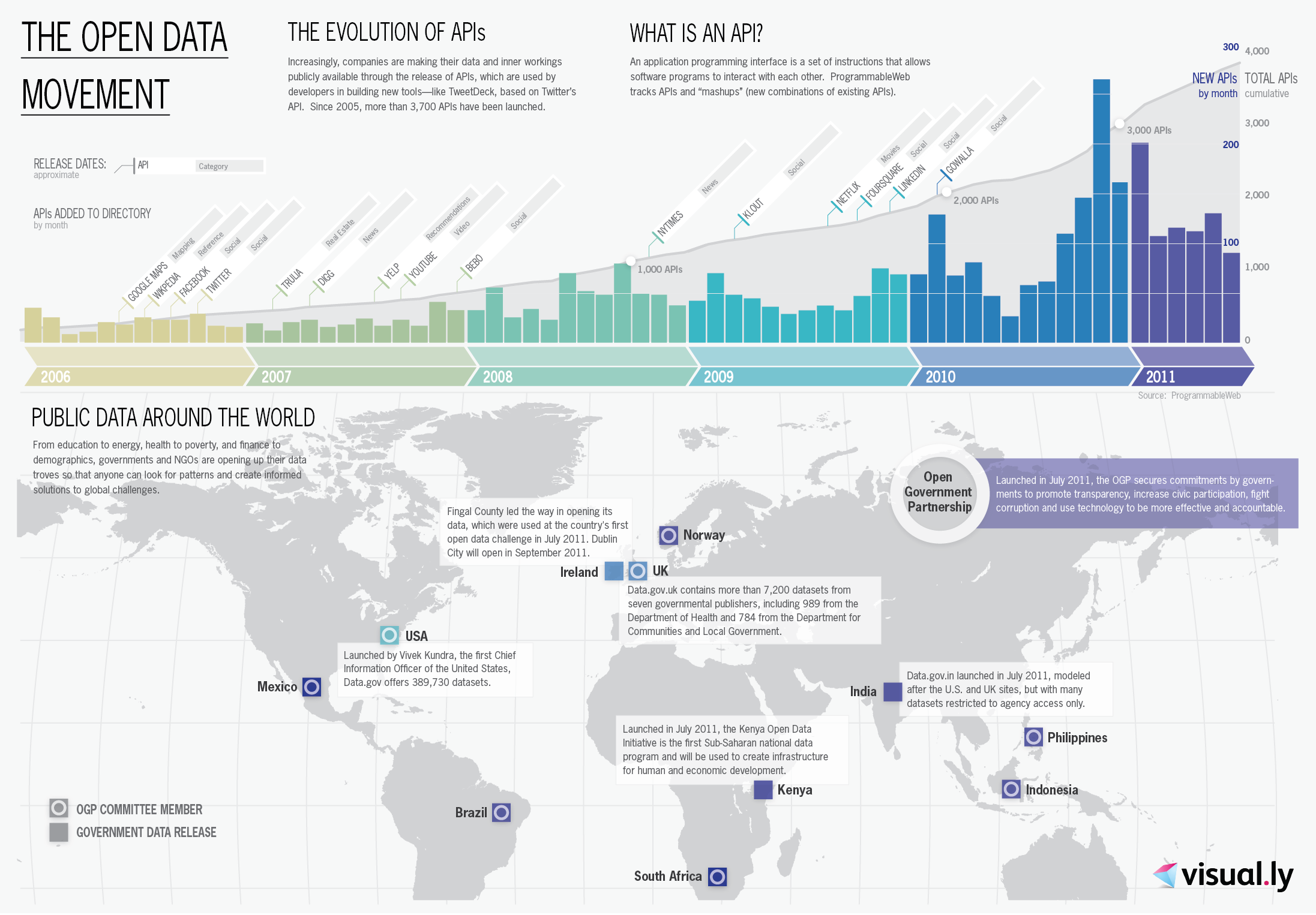 This piece appearing in GOOD magazine shows the increasing pace of companies releasing APIs since 2006, and highlights government initiatives to open data to the public.